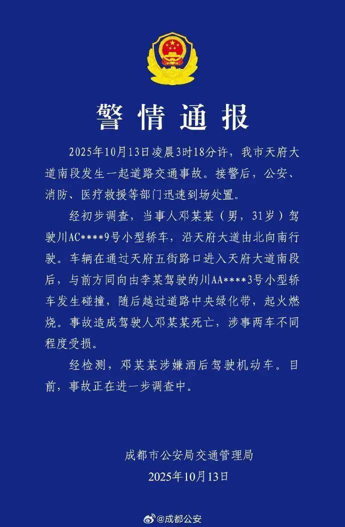 富兴配资端 致1人死亡两车受损!成都通报天府大道交通事故:邓某某酒后驾车